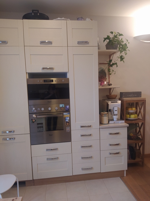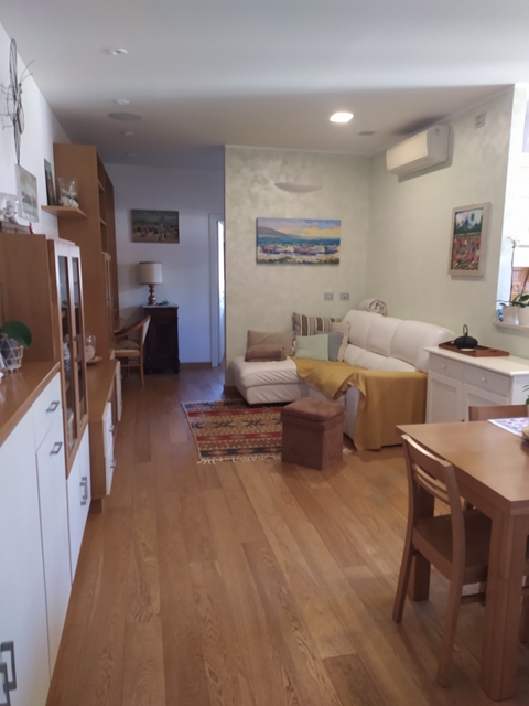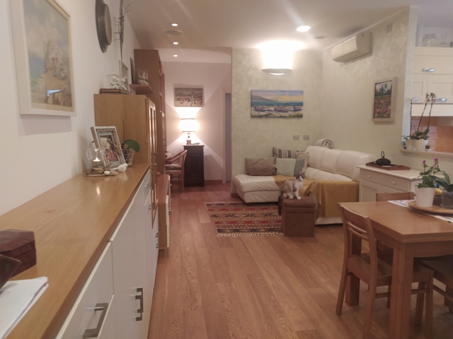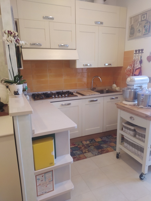 Entrata in grande open space con angolo cottura, due camere matrimoniali e un grande bagno finestrato. Finestre delle ditta INTERNON in pvc e doppi vetri, porte di legno bianche (di cui una a scrigno), parquet in rovere in tutta la casa (bagno e cucina piastrelle in gres)