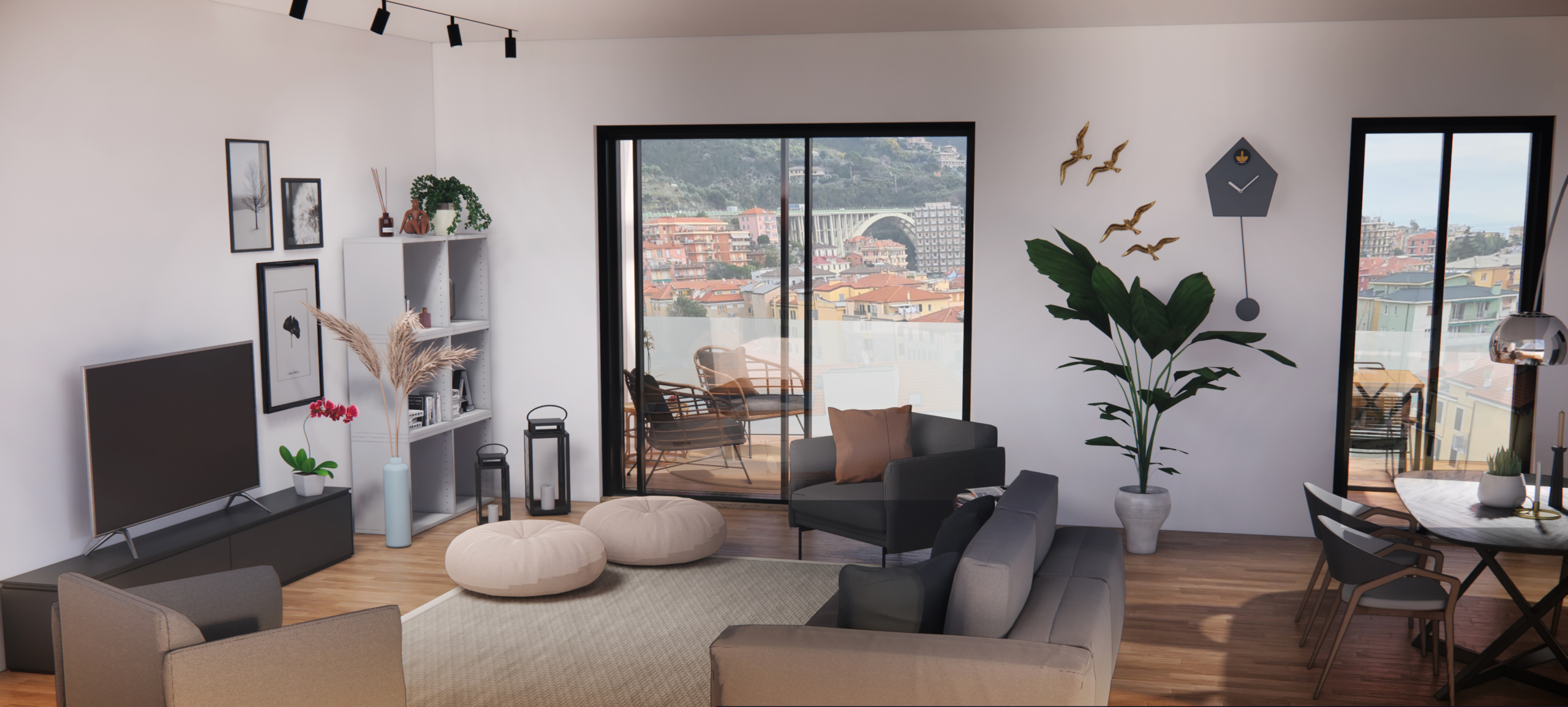 Appartamento n 6: grande trilocale , piccolo ingresso a corridoio, salone luminoso con angolo cottura, terrazza abitabile accessibile dalla zona living, una camera matrimoniale con cabina armadio, camera singola, due bagni con piccola zona lavanderia. € 450.000