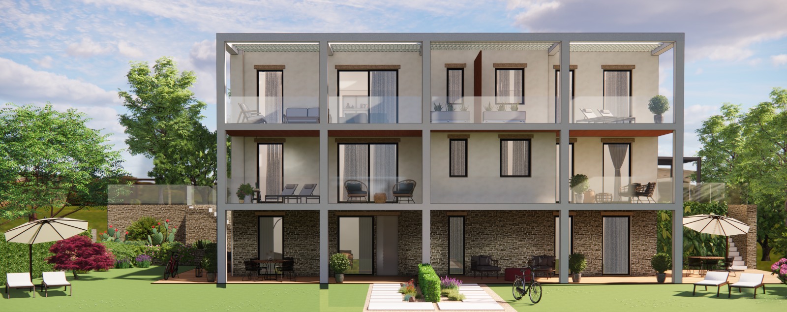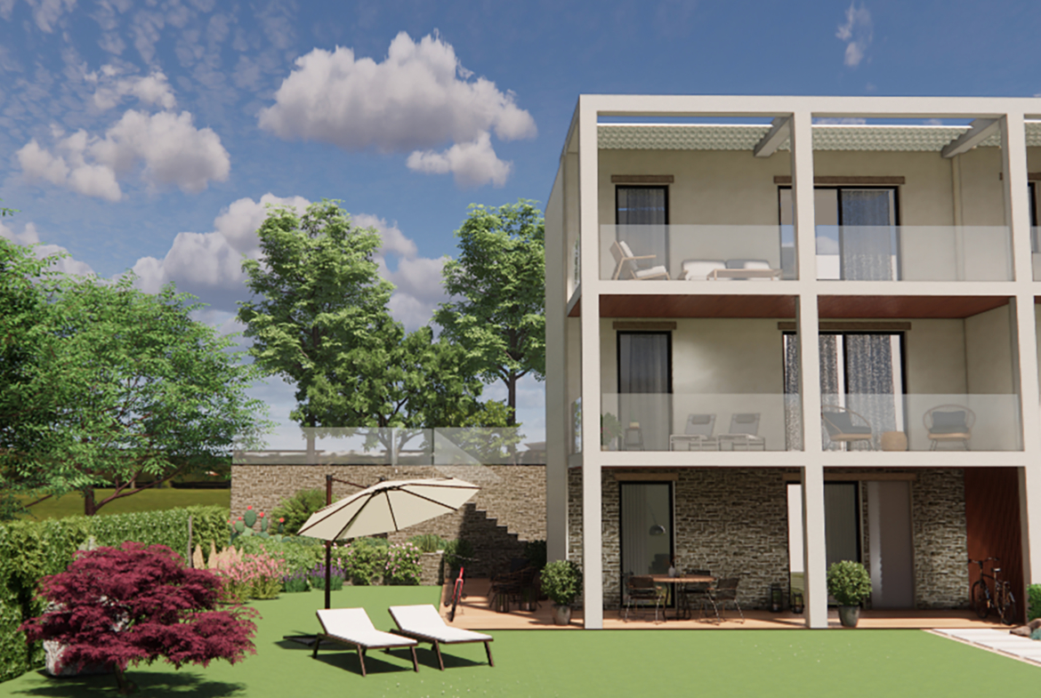 Appartamento n 1: grande trilocale con giardino e loggia di 22 mq circa, salone luminoso con angolo cottura, terrazza abitabile accessibile dalla zona living, una camera matrimoniale con cabina armadio, seconda camera matrimoniale, due bagni e zona lavanderia.Giardino privato di circa 285 mq € 450.000 OPZIONATO